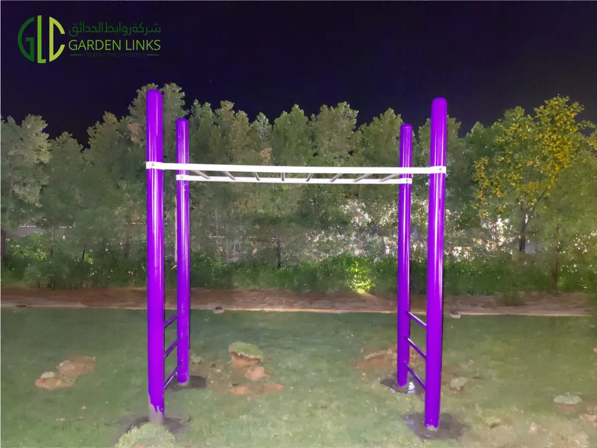The monkey bar structure installed as part of the Outdoor Playground Installation in Al Haeer Riyadh encourages upper body strength development and coordination skills.