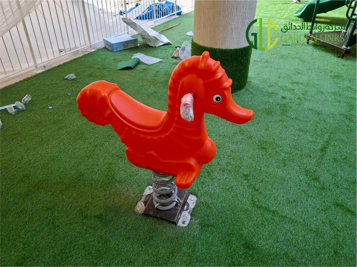 To diversify play options for younger children, a spring rider unit (Seahorse design) was installed as part of the Outdoor Playground Installation in Al Hofuf KSA.