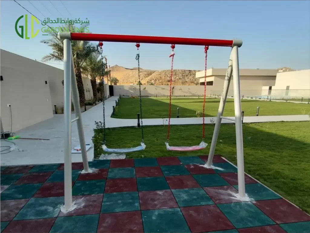 A dual-seat swing set was installed as part of the Residential Villa Playground Installation in Al Bahah. The swing frame features: