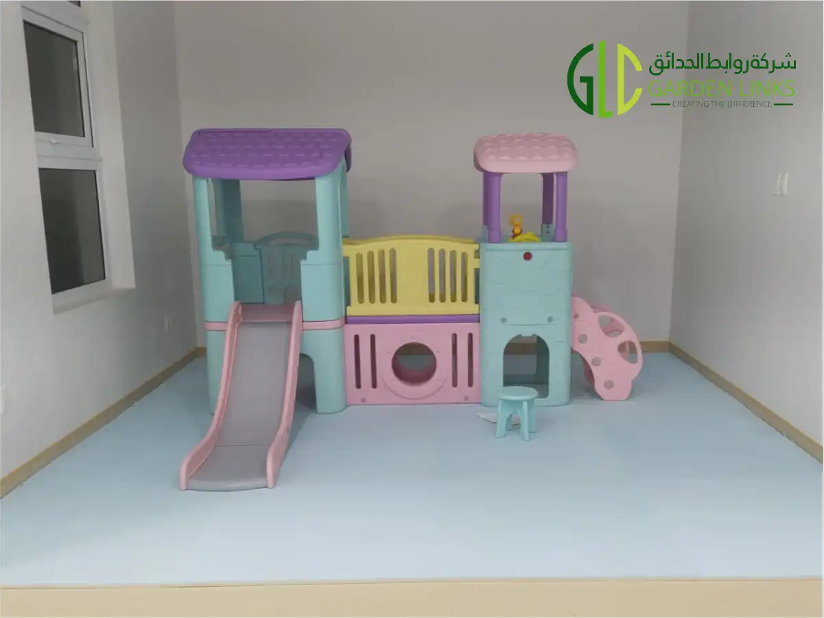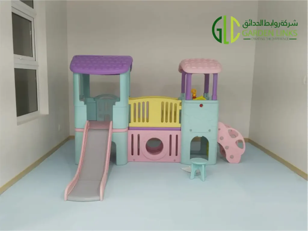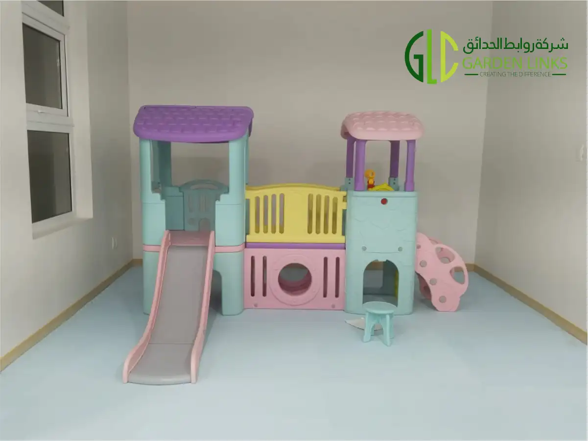 - Preschool/toddler plastic playset (GLP‑001; quoted). Small slide + low platforms + enclosed panels (visible in the pastel toddler area photos).